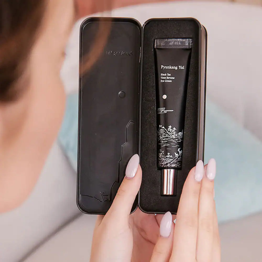 La Black Tea Time Reverse Eye Cream de Pyunkang Yul est une crème contour des yeux riche mais non grasse, infusée en thé noir fermenté et extrait de mûrier pour revitaliser la peau et réduire visiblement les rides et ridules. Sa formule sans parfum nourrit, hydrate et redonne éclat aux regards fatigués.