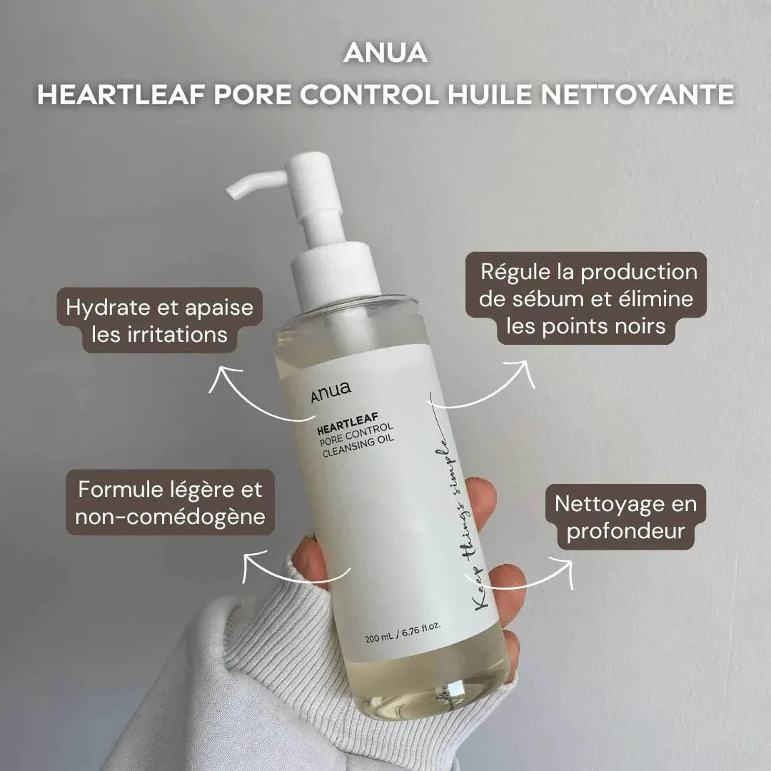 L’Huile nettoyante Heartleaf Pore Control d’Anua est une huile démaquillante légère et purifiante, enrichie en extrait de houttuynia cordata. Elle dissout efficacement maquillage, excès de sébum et impuretés tout en apaisant la peau et en resserrant l’apparence des pores.